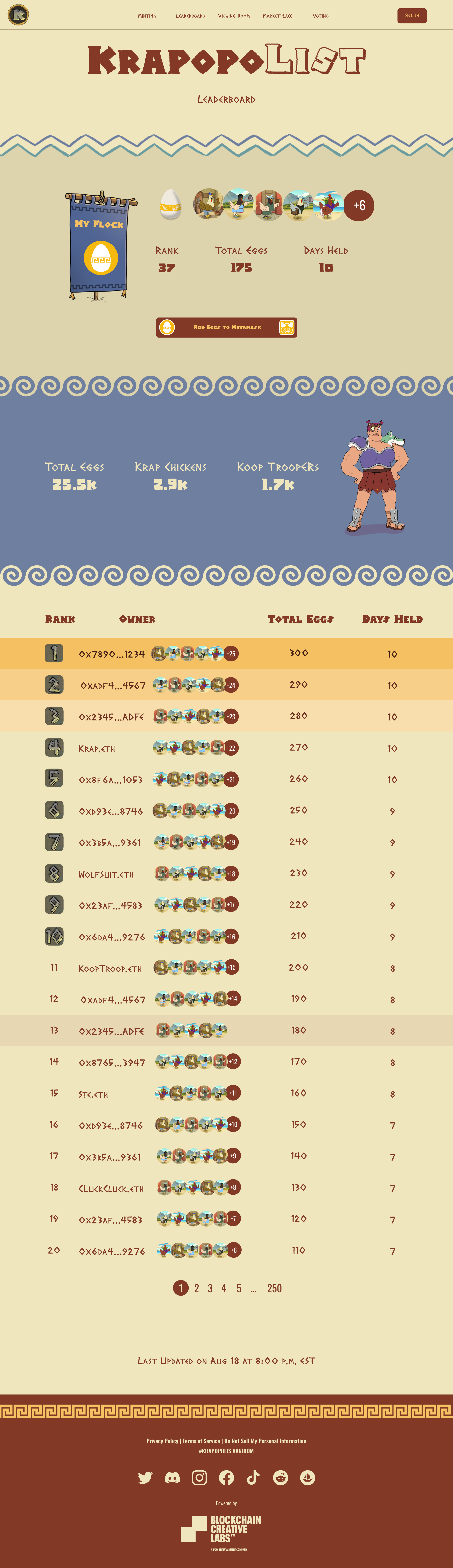 Krapopolis turns fandom into friendly competition. NFT holders climb the ranks by voting on show decisions, unlocking exclusive content, and engaging with the community giving them a visible role in shaping the series and showing off their status in the flock.